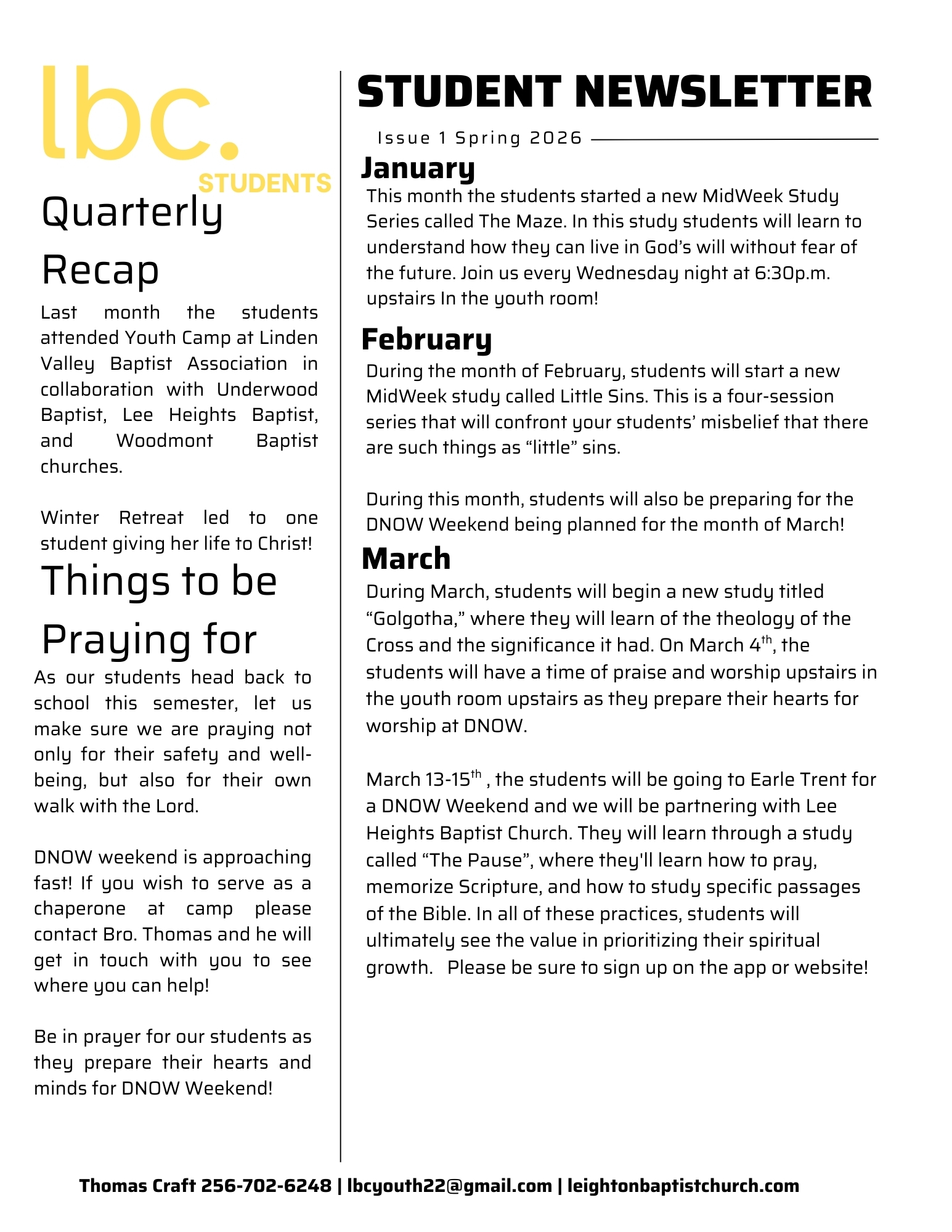 LBC Youth Ministries is a place where every middle school and high school student is welcome to come and be a part. It is our desire that when you come you will feel the warm, loving reception that resonates throughout Leighton Baptist Church. We have a blast hanging out together as a youth group. Whether it’s going to summer camp, winter retreat, concerts, supporting each other in sporting events or the creative arts or just digging in the Word on Wednesday nights, we always have a good time. It’s our goal to be innovative, creative and effective in reaching the students in and around the Shoals area…and not just to be on the ‘cutting edge” in order to be cool, but to ultimately be effective and reach the lost generation exactly where they are.